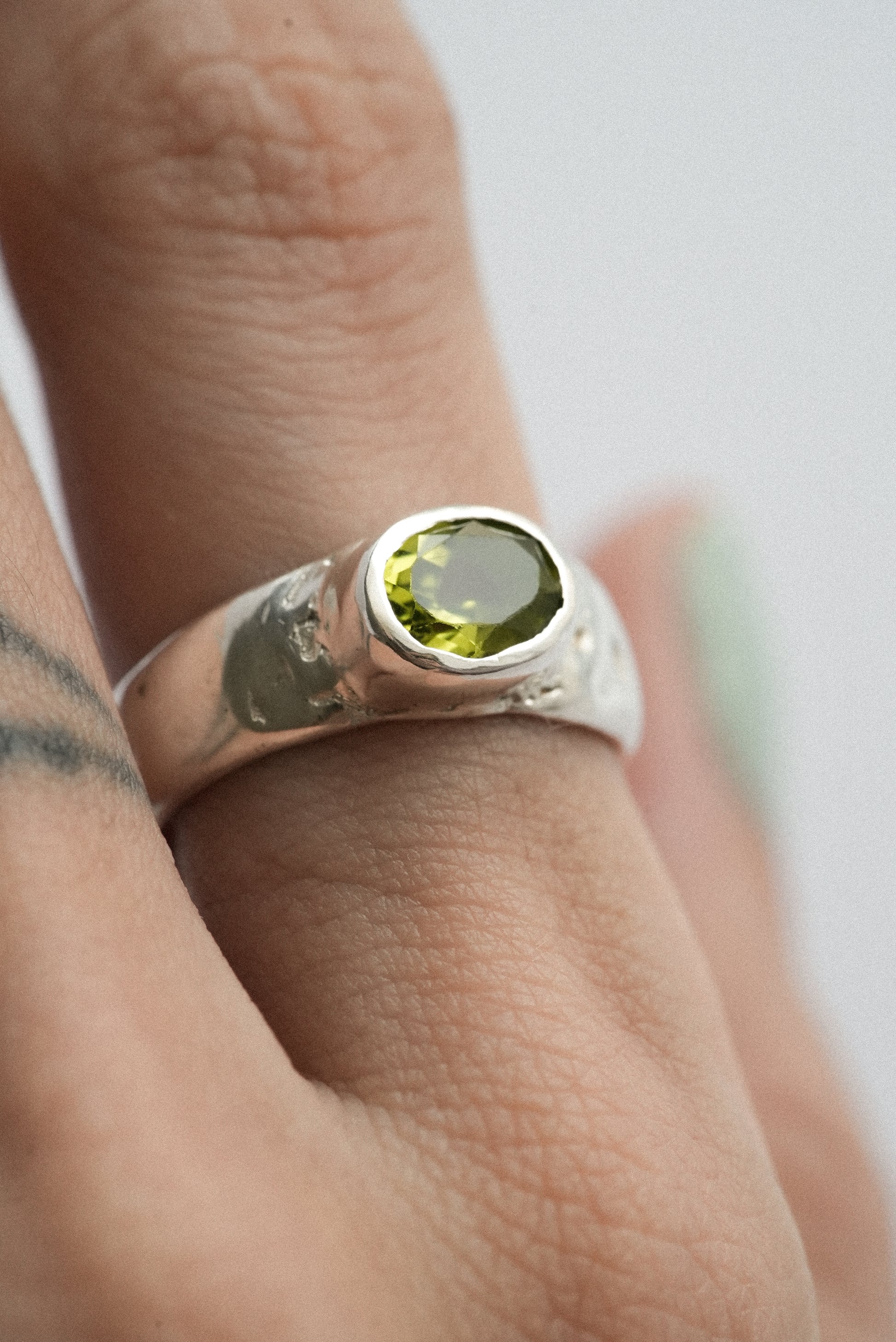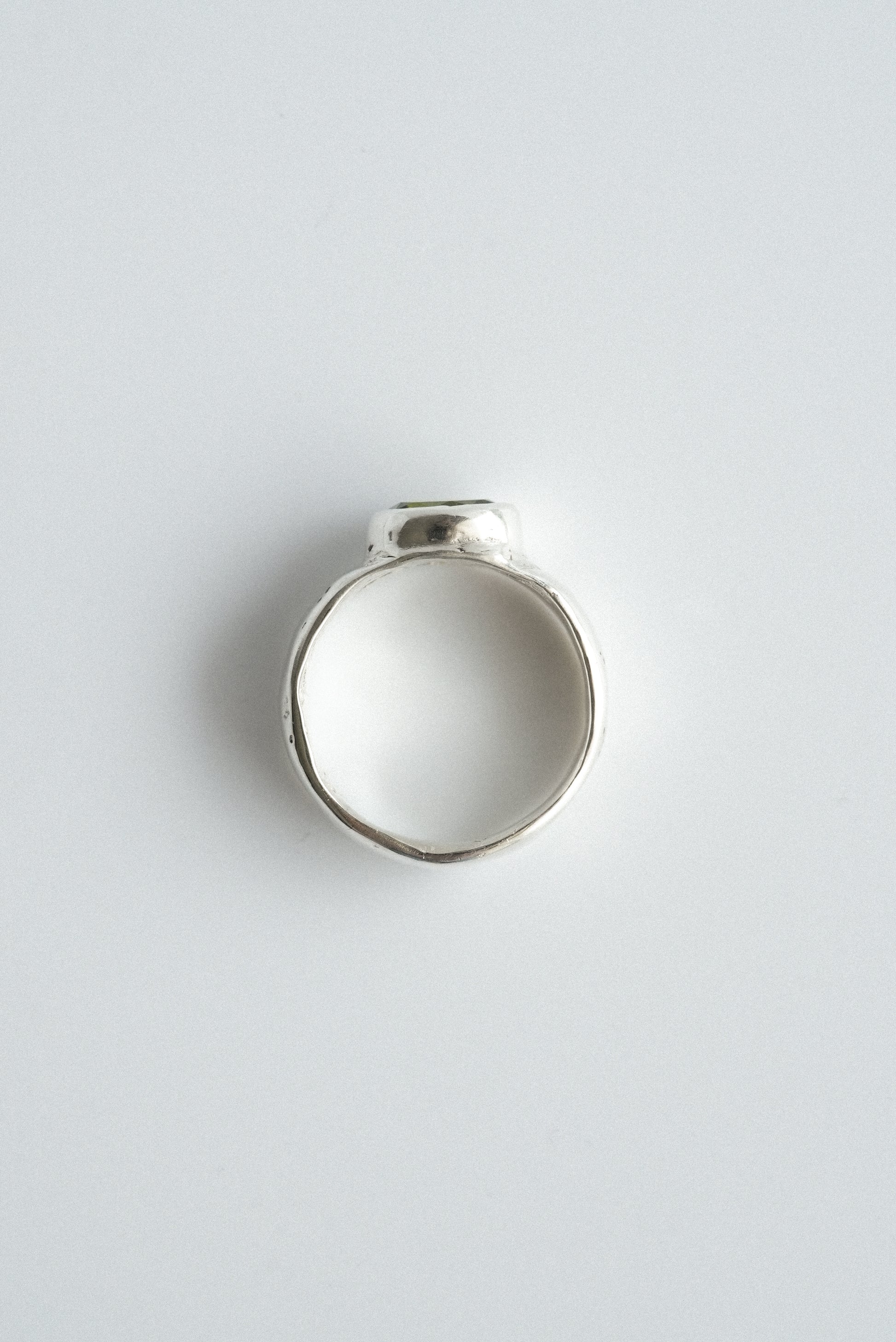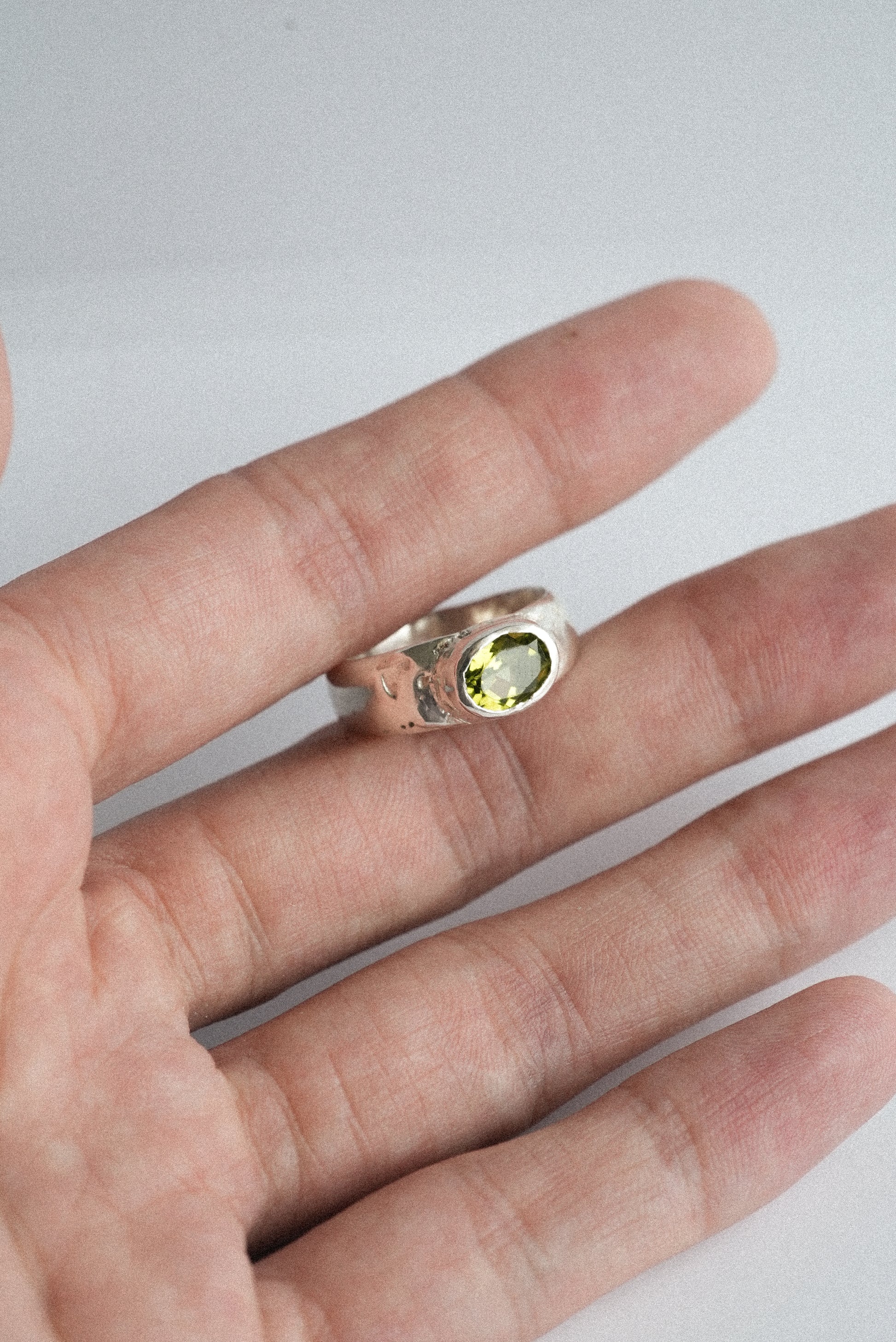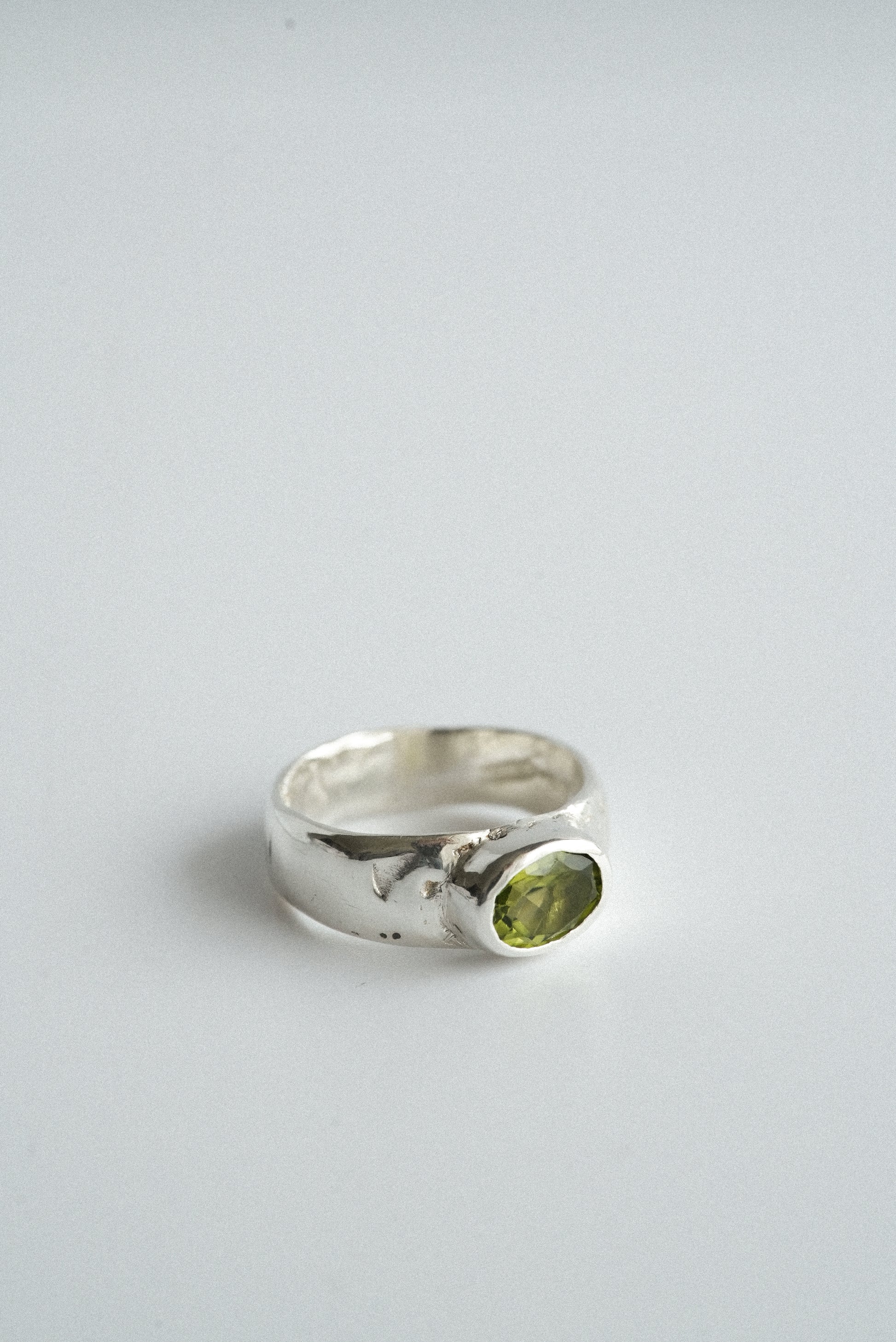 A wide silver band with a Peridot Gemstone